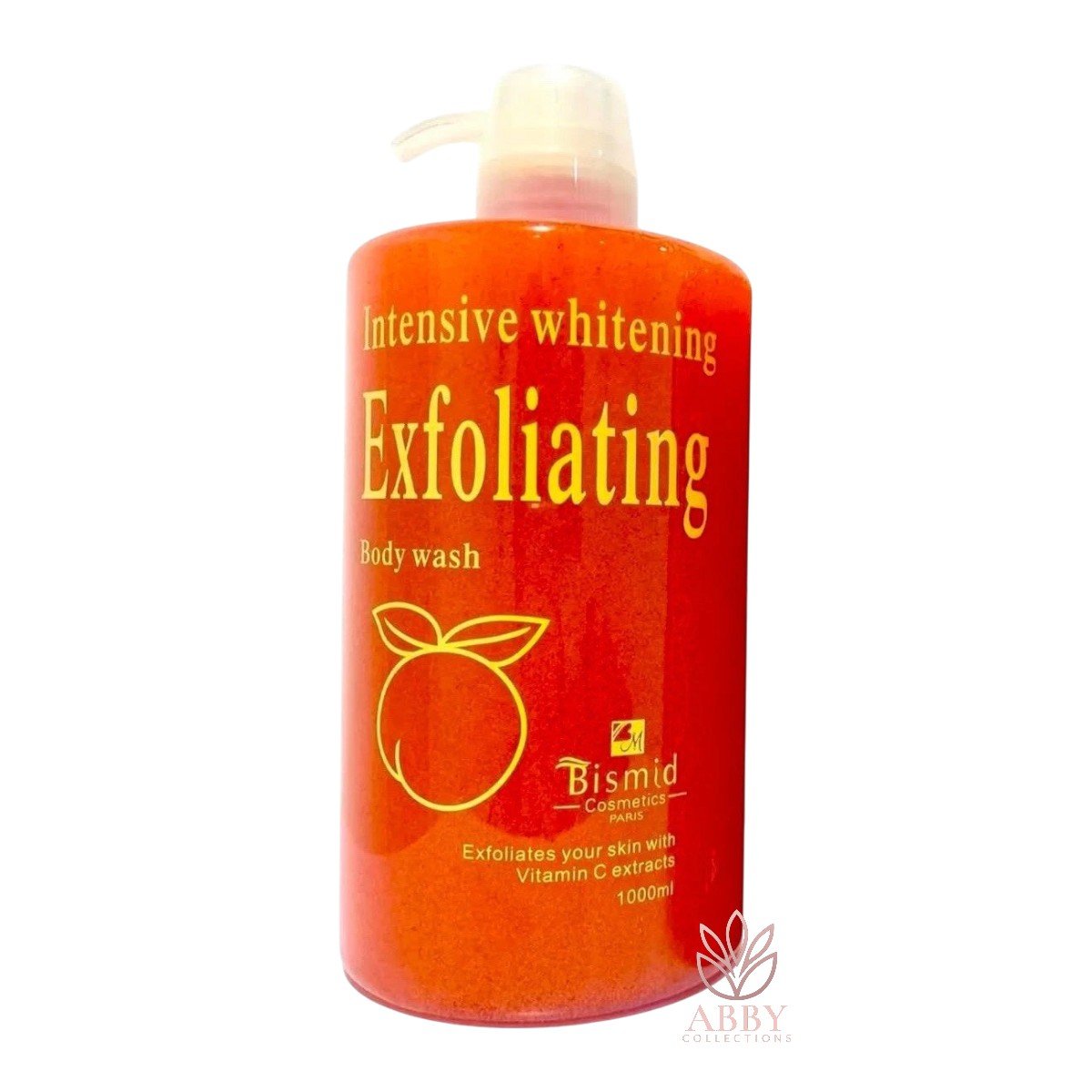 Bismid Intensive Whitening Exfoliating Body Wash (Orange), enriched with Vitamin C extract for a radiant, refreshed look. This orange-colored, exfoliating body wash gently removes dead skin cells and impurities while helping to lighten and even out skin tone.