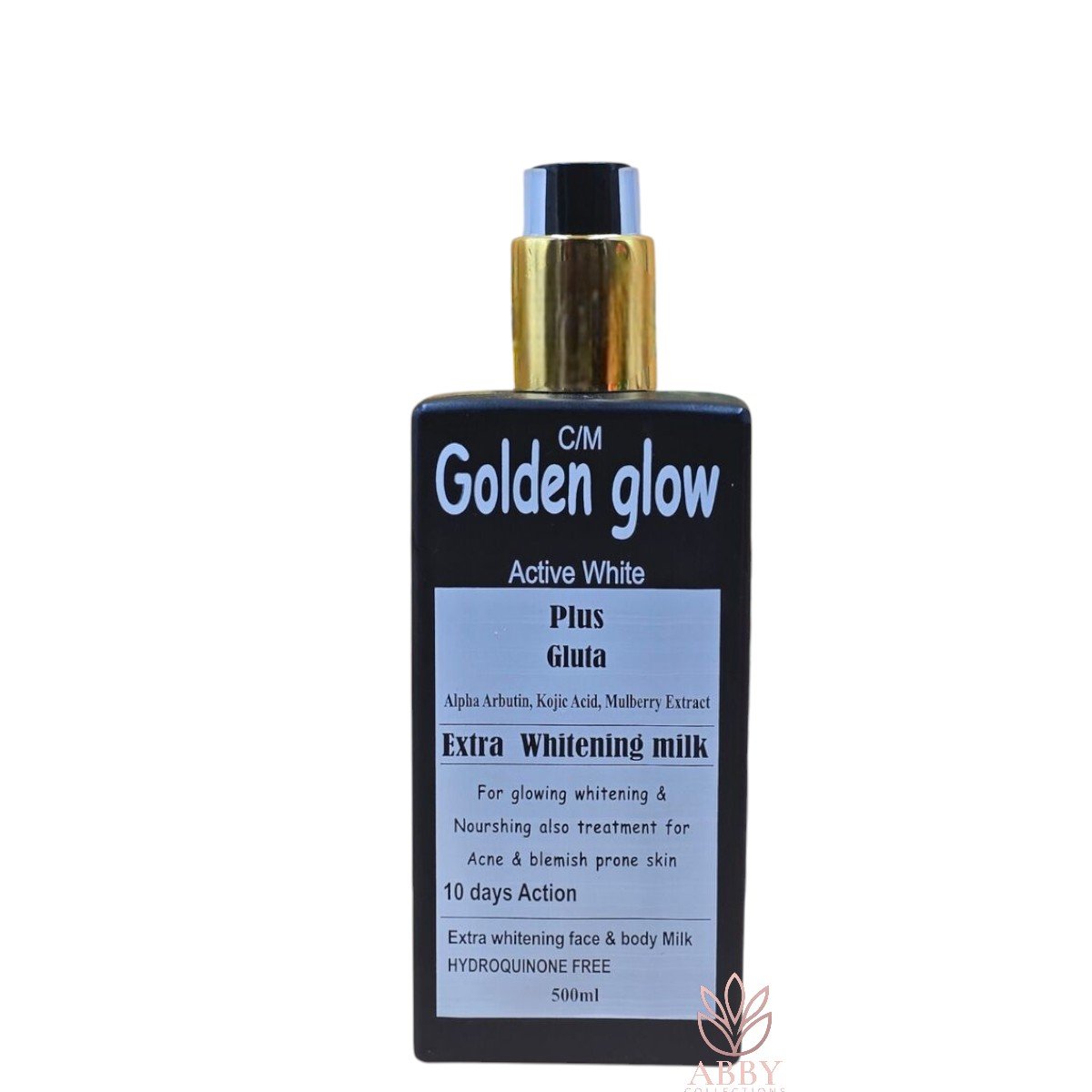 C/M Golden Glow Active White Plus Gluta Body Extra Whitening Milk is a potent skin-brightening lotion enriched with Glutathione to promote extra fair and radiant skin. It helps fade dark spots, even out skin tone, and deeply moisturize, leaving your skin smooth, soft, and luminous.