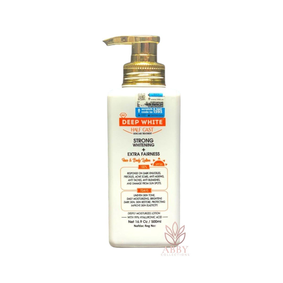 Deep White Half Cast Strong Whitening Extra Fairness Body Lotion is a powerful skin-lightening formula crafted to deliver visible whitening results. Designed to target stubborn dark spots, hyperpigmentation, and uneven skin tone, this lotion deeply nourishes while promoting an extra-fair, radiant glow. Perfect for those seeking advanced skin whitening and lasting hydration.