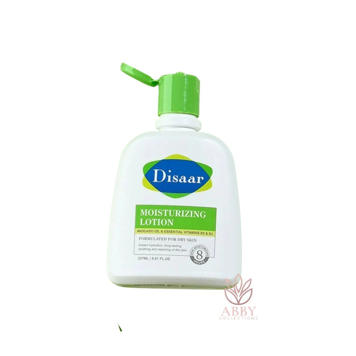 Disaar Moisturizing Lotion with Avocado Oil & Essential Vitamins B5 and B3 deeply nourishes and hydrates the skin while improving its texture and brightness. Avocado oil provides rich moisturization and antioxidant protection, while vitamins B5 (panthenol) and B3 (niacinamide) soothe, repair, and even out skin tone for healthy, radiant skin.