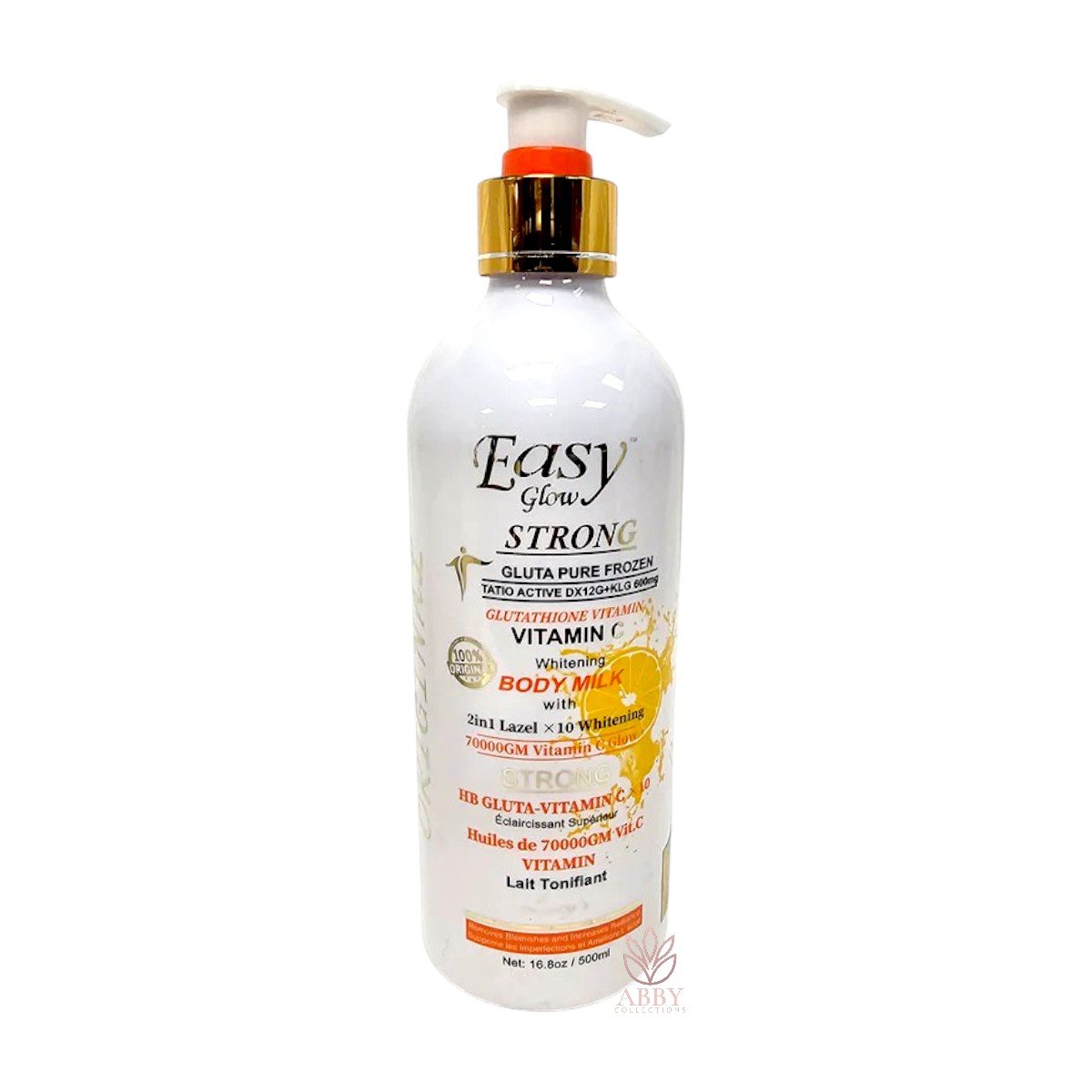 Easy Glow Gluta Strong Vitamin C Radiance Body Milk is a brightening and hydrating body lotion formulated with potent ingredients including glutathione, vitamin C, alpha arbutin, kojic acid, licorice root extract, mulberry root extract, hydrolyzed soy protein, and various vitamins (A, C, D, E). This lotion is designed to fade dark spots, unify skin tone, hydrate deeply, and repair dry, damaged skin.