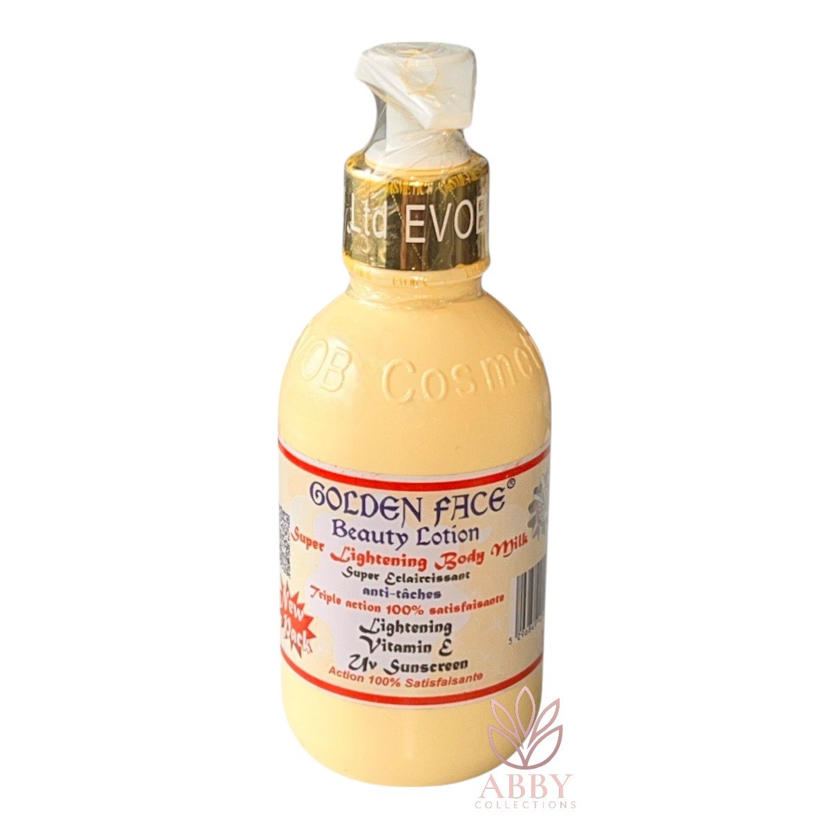 Golden Face Beauty Lotion Super Lightening Body Milk is a potent brightening and moisturizing lotion designed to lighten dark spots, even out skin tone, and deeply hydrate. It leaves your skin soft, smooth, and radiantly glowing with regular use.