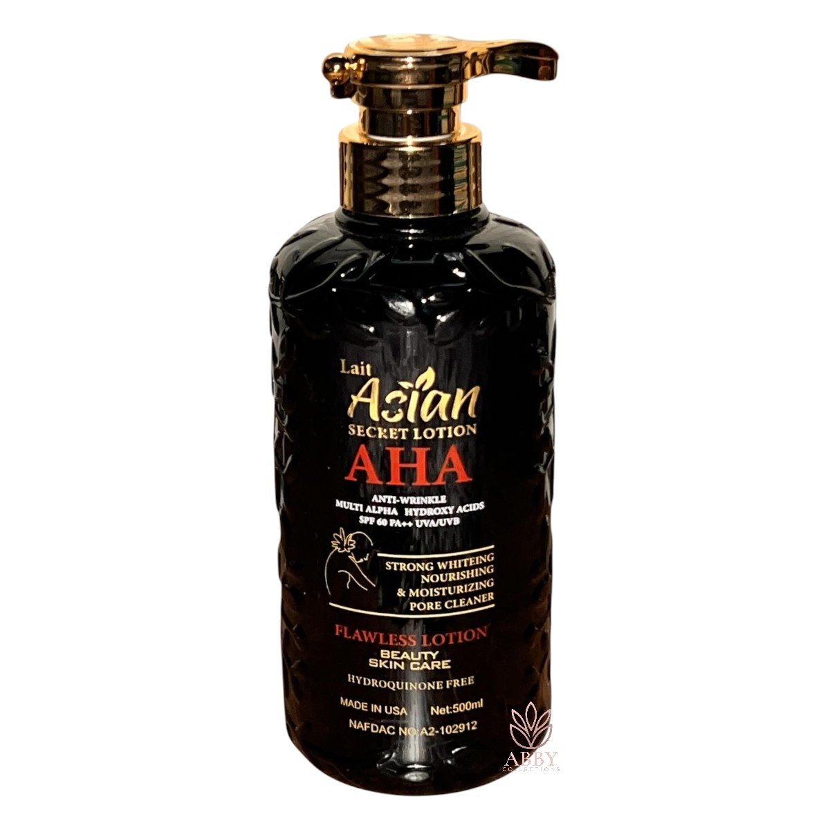 Lait Asian Secret Lotion AHA Flawless Lotion is a body lotion that gently exfoliates to remove dead skin cells, unclog pores, and promote cell turnover for smoother, youthful skin. It helps fade dark spots, sun damage, and blemishes while deeply hydrating and promoting a radiant, even skin tone.