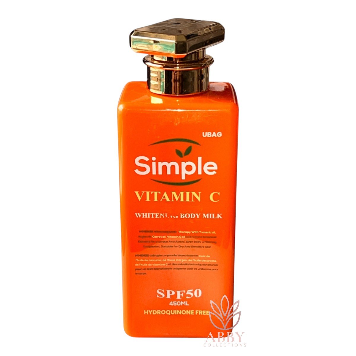 Simple Vitamin C Whitening Body Milk is a gentle yet effective brightening lotion enriched with Vitamin C to improve skin clarity and radiance. It helps lighten dark spots, even out skin tone, and deeply hydrate, leaving your skin soft, smooth, and naturally glowing.