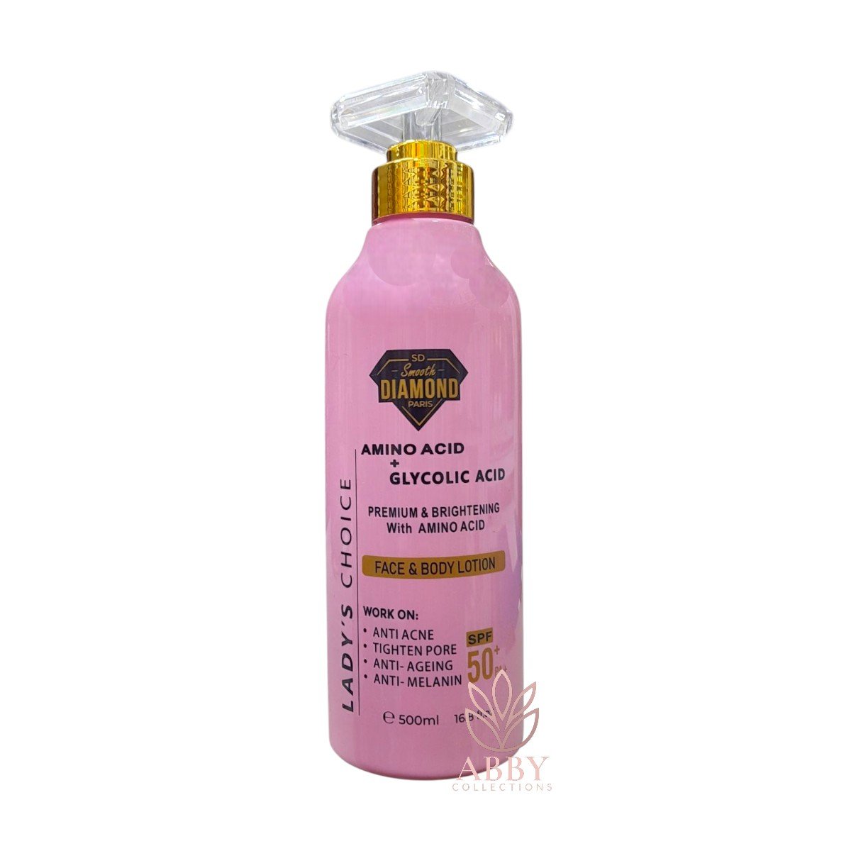 Smooth Diamond Paris Amino Acid + Glycolic Acid Face & Body Lotion is a premium brightening lotion enriched with amino acids and glycolic acid. It whitens dark spots, tightens pores, fights acne, and delays skin aging while providing sun protection with SPF 50+.