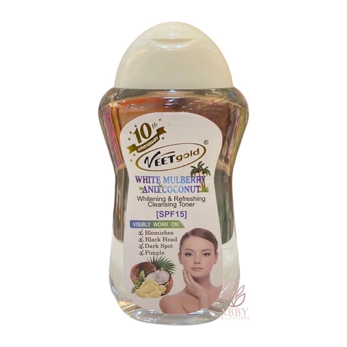 Veet Gold White Mulberry & Coconut Refreshing Cleansing Toner (SPF15) 300ml is a gentle, skin-conditioning toner designed to leave your skin feeling clean, balanced and revitalised. Enriched with white mulberry, coconut extract and soothing botanicals, it helps remove residual impurities while supporting a smoother, more radiant-looking complexion.